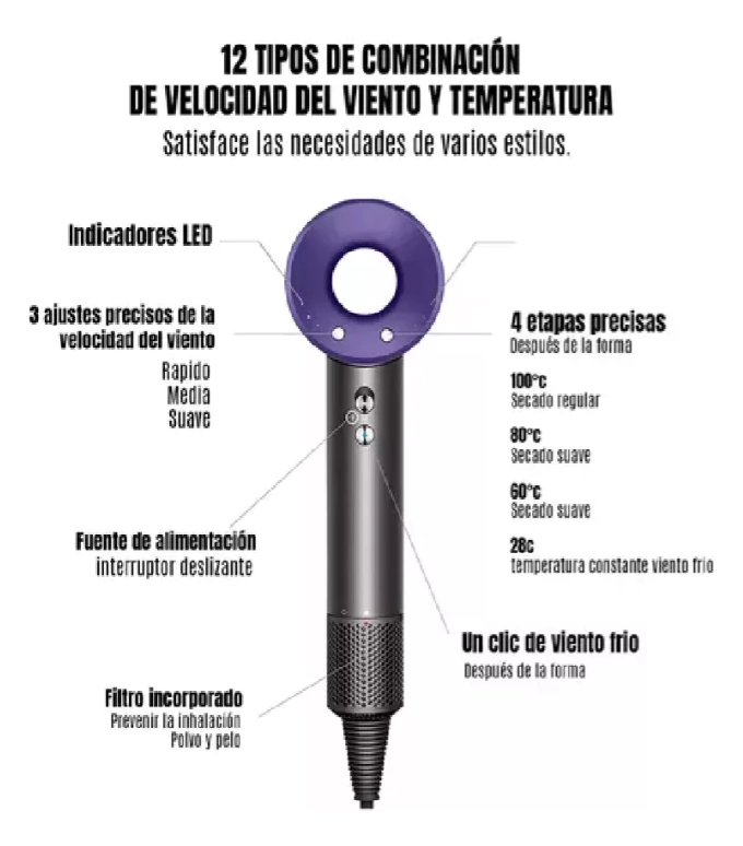 3 temperaturas + 2 velocidades: adaptá el secado a tus necesidades.